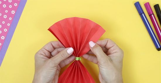 Wrap and tie some string around the middle of the fan. Fold the fan in half first to find the center and make a crease. Wrap a piece of string a few times around the crease, then tie it into a knot. Cut the rest of the string off.