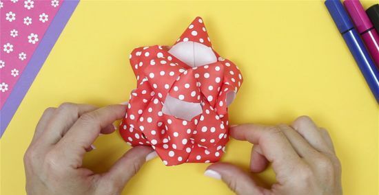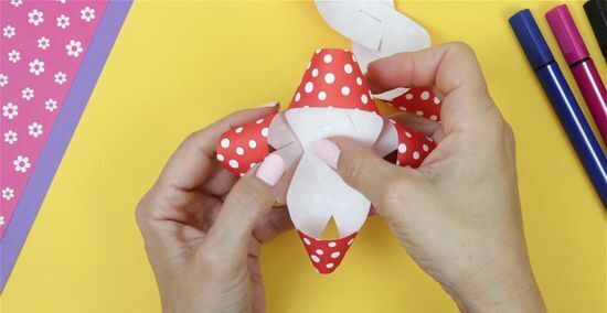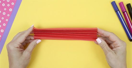 Repeat the process for the remaining strips, except for the tiny one. Fold and twist the ends of each strip to the middle, then staple them in place. Keep your looped strips sorted by size: large, medium, and small. Do not do anything to the tiny strip just yet. Always work from the back of the paper. If you are using wrapping paper or patterned scrapbooking paper, it will be the side that's white.