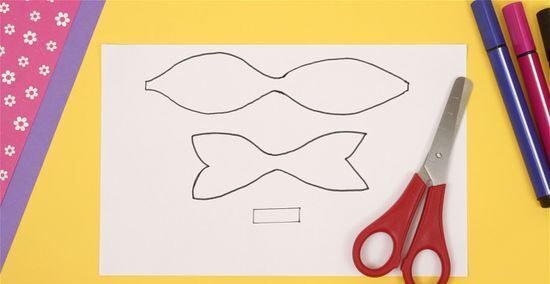 Find a paper bow template online and print it out. Search the internet for a "paper bow template." The template will have 3 parts: a mustache shape, a bow tie shape, and a skinny rectangle. The mustache shape will eventually make the bow loops. The bow tie shape will actually make the bow tails!