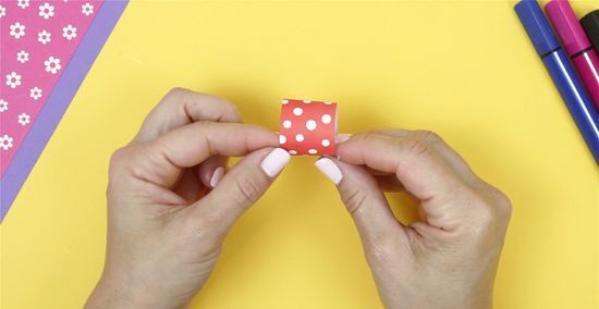 Roll the final strip of paper into a loop and secure it. Take the remaining tiny strip of paper and roll it into a loop with the patterned side facing out. Overlap the narrow ends and secure them with a staple or glue.