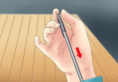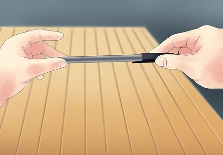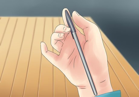 Hold a pen with both hands. Take the pen the long way and hold one end with your pointer finger and thumb and the other with your pointer finger and thumb. At this point, your fingers should be facing your audience. With whatever hand is your dominant hand, apply pressure on the pen with your middle finger, as if it wants to push it back into your palm. The pen should be held out in front of you as if on display. A foot in front of you is good – you want your elbows relaxed as if it is all effortless.