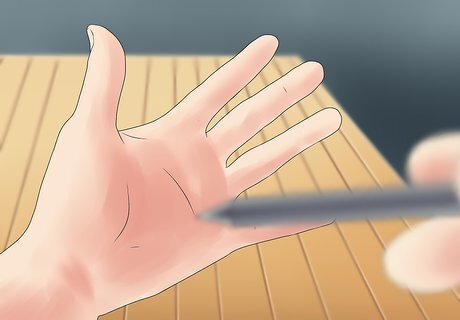 Hold your left palm up in front of you. In this trick, for it to be convincing, it's a good idea to count out loud and gesture with your other hand. This is visually and aurally distracting from what you're actually doing. Tap the pen against your left hand as if that somehow makes the pen disappear-able. The more of a routine you make it, the more impressive the trick will be.