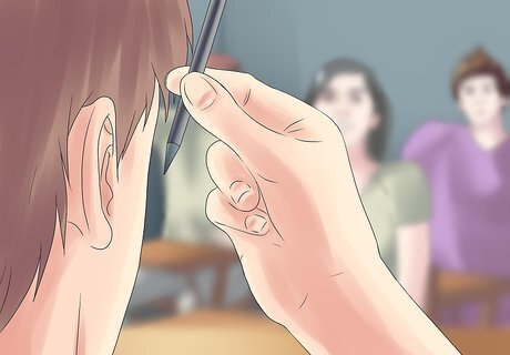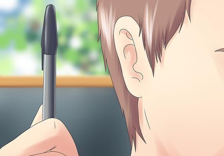 On the third time, place the pen behind your ear. Now comes the actual work. As you raise your hand for the third time, carefully and without losing a beat, place it behind your ear. You must do this smoothly and while focusing on your hand in front of you. The counting is important to help you keep the timing exactly the same each time you raise your pen-holding hand. Try to perform every raising quickly to prevent detection.