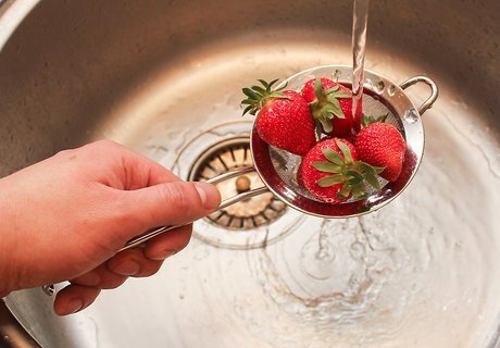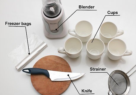 Gather your supplies. To make a rainbow smoothie, you need to blend different combinations of fruit together to make the different colored layers. So along with your ingredients, you'll also need: Seven sealable freezer bags or freezer-safe bowls with airtight lids. Sharp knife and flat surface for preparing the fruit. Strainer for draining the washed berries. Blender and a mixing spoon. Five large cups. Alternatively, you can pour one smoothie and freeze the rest of the prepared fruit for later. This recipe makes about 12.5 cups (3 L) of smoothie, or five 2.5-cup (591 ml) servings