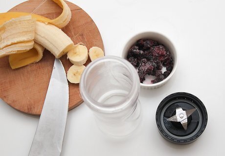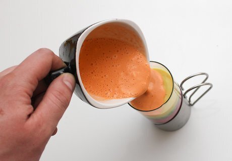 Wash and cut the fruit. As you prepare the fruit, it’s important to keep it all separated until your ready to combine the ingredients for the different layers. To wash and cut the fruit: Peel the bananas and orange. Leave the bananas whole. Chop the orange into one-inch (2.5-cm) chunks. Wash the raspberries under running water and place them in a strainer to dry off. Repeat with the blueberries, spinach, and strawberries. Cut the stems off the strawberries. Wash the peach and cut it in half to remove the pit. Cut the peach into quarters. Wash the beet and cut off the tail and the stem. Cut the beet into quarters. Peel the pineapple and mango. Cut the fruit from around the core of the pineapple and the pit of the mango. Cut the fruit into one-inch (2.5-cm) chunks.