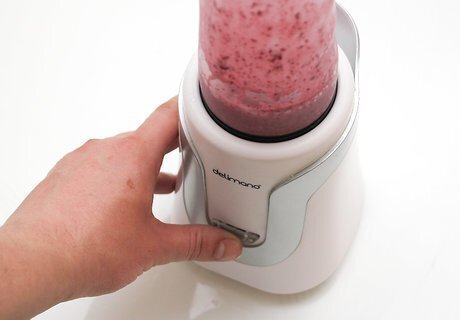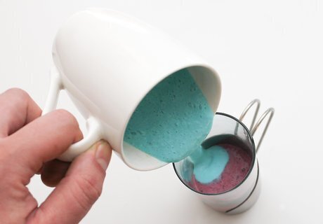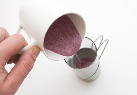 Blend the fruit for the purple and then blue layers. Make the purple layer next by adding the yogurt, juice, and fruit. Repeat using the same process as you did for the magenta layer. When you're ready to pour, remove the glasses from the freezer and spoon in a one-inch (2.5-cm) thick layer (on top of the magenta.) Pack it down and return the cup to the freezer. When you're making the blue layer, don’t forget to add the food coloring, otherwise you'll have another layer of yellow. The food coloring is necessary because blue fruits, such as blueberries, actually turn purple when blended. If you don’t want to use artificial food coloring, you can find natural food coloring, or skip the blue layer.