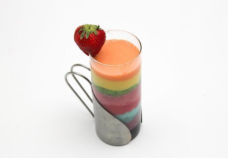 Repeat until you have a full rainbow. Leave the individual fruit combinations in the freezer until you're ready to make that layer. This will help keep the fruit layers frozen, which will keep the colors from blending together. For each fruit layer: Add the yogurt and orange juice first. Blend the mixture until smooth, adding more liquid if necessary. Remove the glasses from the freezer and spoon in a one-inch layer of smoothie on top of the previous layer. Return the glasses to the freezer until you add the next layer. Place any unused smoothie back into the freezer. Rinse out the blender.