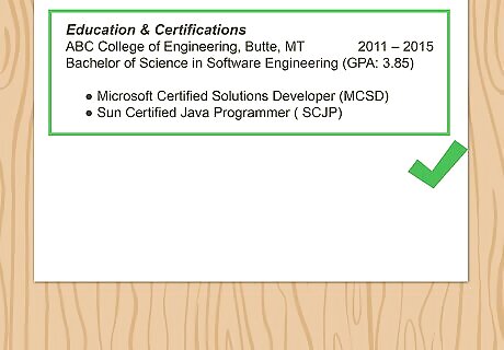 Include relevant education or certifications. Typically, your highest degree is the only one you need to include on your resume. However, you should include lower degrees if they're relevant to the job you're applying for. Additionally, list any relevant licenses or certifications you have. For example, if you've just graduated from law school and are applying for a job as an attorney, you would want to include your law degree on your resume as well as the bar you've been admitted to. If you're admitted to practice in any other courts, you would want to list them as well. If you're creating a functional resume, your education section will probably be at the bottom of the page. Some people leave education off of a functional resume entirely. However, include it if the job post lists a specific degree as a requirement. If you had a cumulative GPA of 3.5 or higher, feel free to include it with your educational information. Otherwise, you should leave it out. If you're listing more than one degree, include your GPA on both of them if possible. Otherwise, don't include it at all.Tip: If you have a terminal degree that is essential to your line of work, you might include it in your header instead of creating a separate education section. This can free up some precious space.
