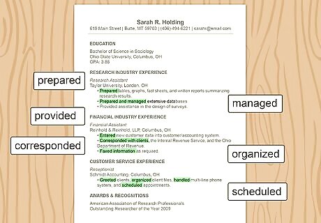 Edit your resume to eliminate excess words and create space. Active, punchy text is essential in a resume, since the document will likely only be glanced at for a few seconds. Remove pronouns, articles, adjectives, and adverbs. The final statement should communicate only the action and the result of that action. For example, suppose you worked as a barista at a café. You might include a bullet point that you maintained high sanitation standards. However, you want to make that as quantifiable as possible. You might say "Implemented new sanitation program; increased café health and sanitation score by 11%." Make your bullet points personal, rather than just rattling off the job description for the position. For example, if you were a retail sales associate, you might say "Exceeded all personal sales goals for 4 months" rather than "Sold clothing and accessories to customers."