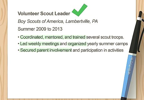 Lead with groups of skills for a functional resume. A functional resume puts emphasis on what you can do, rather than on what you've done. Brainstorm a list of 4 to 5 categories of skills that you have experience or education in. Then include a brief description of the skill and bullet points with specific examples of when you put that skill to use. For example, if you're creating a resume for an online writing job, you might include "editing" as one of your skills. One of your bullet points might state the number of articles you've edited on wikiHow and any accolades you were given for that work. Even if it's volunteer work, it's still experience as an editor. You can also include relatively soft skills. For example, you might list "team leader" as one of your skills. You could then include bullet points detailing your work in student government, organizing a rally for a nonprofit organization, or working as a camp counselor.
