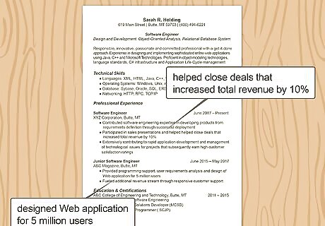 Tailor each resume to the specific job you're applying for. You may have a master resume that includes all of your skills, education, and experience. However, the resume you give to each potential employer won't necessarily include everything. Only include skills and experience that are directly related to that job. Try to make your resume match the job listing as closely as possible. Move sections around if needed so that the most important qualifications listed in the job description are at the top of the page. Rearrange your bullet points as well, putting the most relevant information first. Even if you're proud of a particular accomplishment, take it off your resume if it doesn't relate to the job in any way.Tip: If you're applying for a job that's a departure from your previous career path, it can be helpful to add a summary that explains your interest or why you're applying for that position.