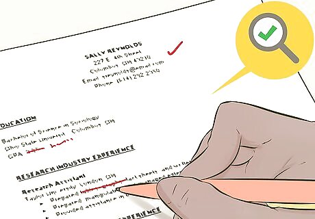 Proofread carefully before submitting your resume. Don't rely solely on the grammar and spelling checkers built into your word processing app. Read through your resume several times to make sure it's error free. Reading out loud can also help you find errors or awkward wording. Be careful with apostrophes and contractions. If you have difficulty with contractions and possessives, read what you've written as though you spelled the full words out rather than using an apostrophe and see if it makes sense. For example, you could easily find the error in the sentence "Trained sales staff and reported they're progress" if you read it as "Trained sales staff and reported they are progress." Make sure your formatting and punctuation are consistent. For example, if you use bullet points in one section, you should use them in all sections. Free online apps, such as Grammarly, can help you find errors you might not have noticed on your own.Tip: Start at the last word and read each word in isolation, moving backward through the document. This removes the narrative structure to help errors stand out more.