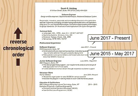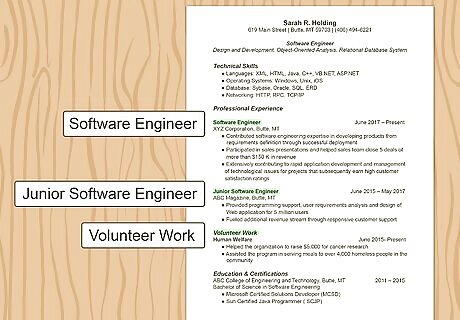 List work experience, including relevant volunteer work. For a chronological resume, add specific jobs and other work experience in reverse-chronological order, starting with the most recent job you've had. Use specific, descriptive job titles that tell potential employers exactly what you did through that experience. Generally, you should include the month and year you started and ended the job in a chronological resume. However, if you worked there for several years, just the years are typically fine. With a functional resume, you have a little more leeway in how you include your work experience. You don't necessarily have to include the dates you worked for a particular employer, although you should indicate the length of time you worked there. For example, you might say "Managed 20-person sales force for 10 years." Use active verbs to describe your responsibilities and accomplishments. Specific numbers and metrics show potential employers exactly what you achieved. For example, if you were a sales manager, you might include a line such as "Implemented changes that increased sales by 27% in 1 quarter." EXPERT TIP Charbel Atala Charbel Atala Talent Acquisition Strategist & Managing Partner Charbel Atala is a Talent Acquisition Strategist & Managing Partner at Talent Gurus, a game-changing retained search firm located in the heart of San Francisco, California. With a unique blend of over five years in talent acquisition and a solid 15-year background in corporate law, Charbel crafts performance-driven talent solutions that are tailored to each client's unique culture and needs. Charbel Atala Charbel Atala Talent Acquisition Strategist & Managing Partner Leverage your achievements strategically on your resume. Be selective in choosing which professional and academic accomplishments to highlight on application materials. Only showcase achievements that prove you possess strengths and capabilities needed for the target role.