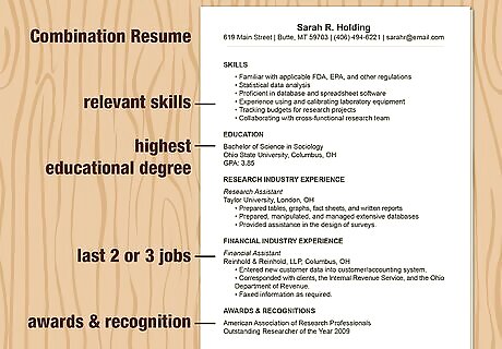 Combine a chronological and functional resume to highlight your skills. You can still use a functional resume even if you're looking for a job in a more conservative field. Lead off with a skills section, then include chronological sections underneath. Because this type of resume can get lengthy, consider only listing your last 2 or 3 jobs and your highest educational degree. If you've been at your most recent job for over 10 years, you may want to only list that. You can make clear in the functional part of your resume how long you've been working in the industry.