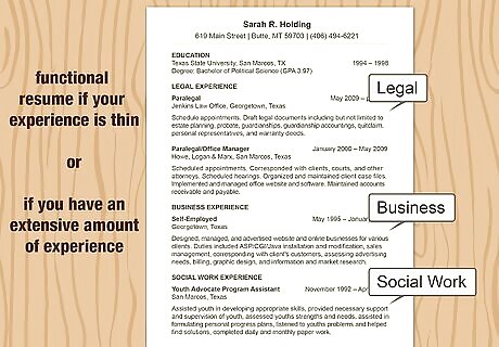 Try a functional resume if you lack direct work experience. With a functional resume, you can highlight your specific skills and assets without having to list every job you've ever had. This can be a benefit if your work experience is thin. A functional resume is also a good choice if you have an extensive amount of experience and want to limit your resume to a page. You can focus on the skills you've developed rather than having to list each individual job with specific details.