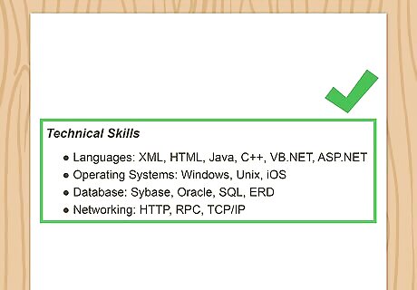 Emphasize hard skills that make you a more valuable employee. Even on a chronological resume, you might have a skills section if you want to let the hiring manager know about skills you possess that are relevant to the job. Focus on hard skills that can be objectively evaluated, such as computer or technical skills or languages. It can be tempting to fudge a little in your skills section and exaggerate your skill level to sound more impressive. However, this can get you in trouble. For example, if you only know a handful of words and phrases in Spanish, don't put on your resume that you're conversational or even fluent. If the hiring manager starts talking to you in Spanish, you've eliminated your chances of getting hired. If specific skills were listed in the job post and you happen to have those skills, on the other hand, include a skills section and list them along with detail about your proficiency.Tip: If you don't have a lot of work experience, you may want to include soft skills, such as "diligent" or "self-motivated" as well. Just make sure you back them up with concrete examples that demonstrate that trait.