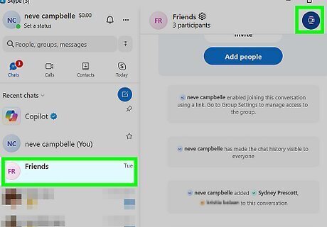 Start a group chat to add more people to the call. If you want to do a group call, there are a couple ways to do it: Click the Chats tab at the top of the lefthand menu pane, then select a group chat and click the Android 7 Videocamera Video Call button to call the whole group. To make a new group chat/call, select a contact or one-on-one chat, then click the Create New Group button at the top right side of the window. It looks like a person with a + sign. Add the other members of your group, then click the Android 7 Videocamera Video Call button.