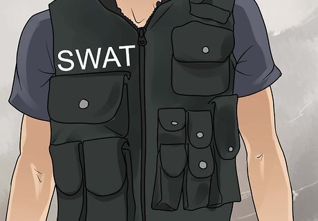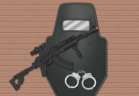 Carry toy gear. This may include toy guns, handcuffs, SWAT shield, and baton for example. If you don’t already have these toys around then a toy store, department store, or costume shop may have these individually sold for relatively low cost. Make sure you buy toy versions of all of these items and never bring the real thing to a costume party. Costume guns, like the toy AK-47 for example, are designated as such by the bright orange tip on the barrel.