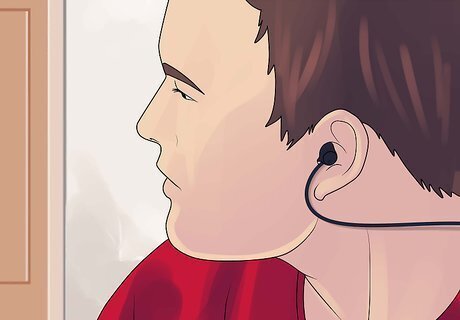 Plug your ears. You may want to add an ear piece to simulate a radio contact. A pair of thin-style headphones or earbuds that are black can work under your hat or helmet. Coil some black string or black wire from the ear piece to the back of your vest you’ll set up in a later step. Twist the string or wire around so it looks like a cork screw or spiral. Use black electrical tape to bind both ends of the wire between the back of the vest and the plastic backing of the ear piece respectively.