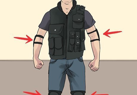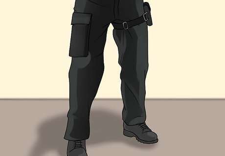 Put on the right pants. You can go with long pants or shorts but either version needs to keep with the black motif. Compare the pants color to the vest to be sure you are wearing the same shade of black top and bottom. Select a pair with a decent number of pockets. While your vest should already have many pockets you can benefit from additional ones. Pick pants with heavy duty stitching. Stronger stitching will be more comfortable and help your pants hold extra accessories.