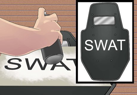 Write the correct logos. You can use a stencil and white marker or spray paint for this. Or buy the logos. You can copy the SWAT logo onto a stencil such as construction paper or cardboard. Draw it on with a pen or black marker that makes it easy to see for cutting later. Cut out the marked logo from the paper or cardboard. Make sure only the letters are cut out. Use masking tape to tape the stencil onto the area you want to put the logo. This should be the front right pocket of the vest for a smaller stencil, and across the top-back of the vest for a larger one. Use white marker or spray paint to fill in the stencil and apply the logo to the target area. Some costume shops may sell decal logos you can stick on, or sell pre-made stencils.