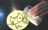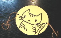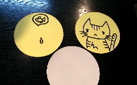 P7100014s_14.jpg Cut two pieces of paper into a circular shape of the same size as the board piece. You can do this by tracing the board piece on the paper twice, then cutting along the outlines. Draw a picture on each piece of paper. In this example, there is a cat on one piece and a teardrop and fishbowl on the other piece.