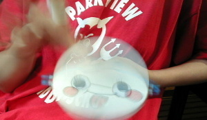 P7100020s_109.jpg Wind up both rubber bands. Hold a rubber band in each hand and have someone flip the card over and over until totally twisted tight. Pull each rubber band apart quickly and the card will start spinning. If you used string or yarn instead, pull them tight, holding the ends with your index finger and thumb, and rub the fingertips together to turn the string (as shown in the video below). Your thaumatrope creation is transformed into a single picture by the twisting action. Repeat as often as wished. Children will be mesmerized.
