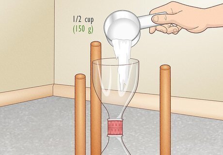 Funnel in ½ cup (150 g) of salt into the spout. Pour at least ½ cup (150 g) of white salt or sand (191 g) through a funnel into the bottom section of your hourglass. Note that every ½ cup of sand or salt is equal to 1 minute of time in the physical hourglass. If you don’t have sand or salt on hand, you can purchase it at a craft or grocery store, respectively. Salt can provide a lighter contrast to the bright paint color of your stool. When interacting with young children, try to keep the minutes of timeout equal to their age. For instance, if you’re dealing with in a 2-year-old, consider adding 1 cup (300 g) of salt into the stool, which will take 2 minutes to funnel through the hourglass.