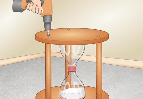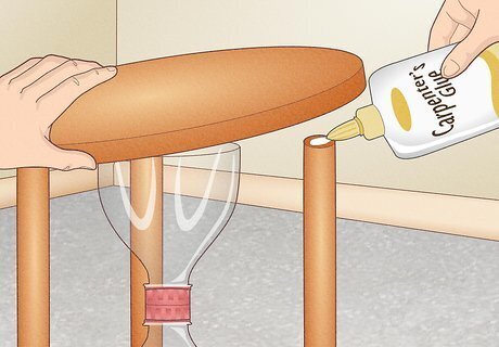 Secure the top wooden base to the dowels and hourglass with wood glue. Squeeze another dot of glue onto the center of each dowel. Additionally, add a thin ring of glue around the small wooden circle attached to the base. After applying the glue, position the base over the dowels and open hourglass spout, then press it into place for several seconds. The glue provides an extra layer of stability to your stool. This only applies to the top portion of the stool.
