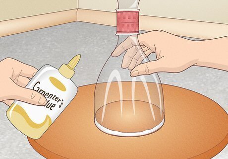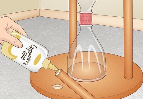 Glue the hourglass to the base wooden piece. Apply a thin stream of wood glue around the border of the small, central circle. Next, arrange 1 end of the spout over the ring of wood glue. To secure this half of the hourglass, hold it in place for several seconds. Don’t glue the other half of the hourglass into place yet. The wide, cut end of the plastic bottle needs to fit snugly around the small wooden circle.