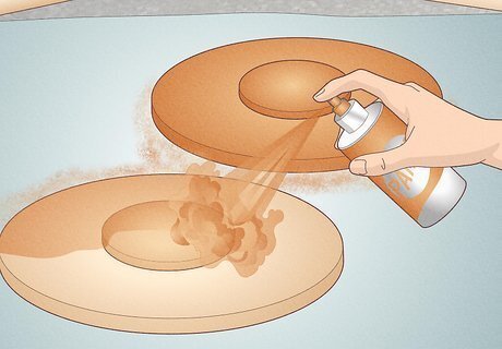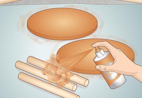 Spray paint 1 side of the circles and dowels in the color of your choice. Arrange a piece of newspaper or drop cloths in an outdoor or well-ventilated area. Place your 2 wooden circles and 3 wooden, 1⅛ in (2.9 cm) thick dowels on this surface. Spray an even coat of paint over all 5 wooden pieces until they’re all completely covered. Before you start painting, slide on a face mask or respirator to prevent you from inhaling any paint particles.
