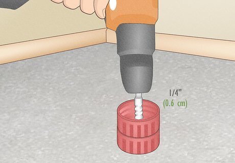 Drill a ¼ in (0.6 cm) wide hole through the bottle caps. Attach a thin drill bit into your electric tool to create a smaller hole, which allows the sand or salt to travel smoothly between both halves of the hourglass. Next, drill in the center of these glued caps, applying enough pressure so the drill bit creates a hole through the center of the plastic. You don’t want the hole to be too big, or else the sand will pour too quickly. Wear safety glasses and a face mask as a precaution whenever you work with power tools.
