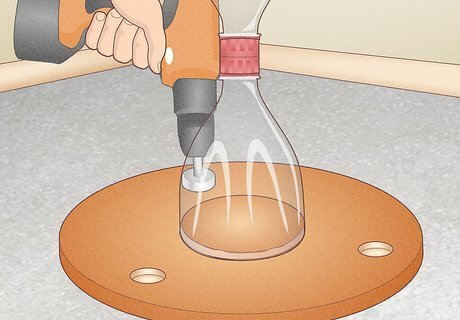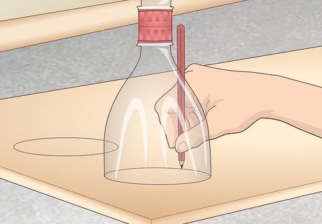 Sketch 2 wooden circles that fit snugly into the soda bottle base. Take a thinner, ½ in (1.2 cm) plank of wood and clamp it to your work area with a table vise. Arrange the wider end of your soda bottle spout on the plank, then sketch around it in pencil. After drawing 2 circles onto the wood surface, use a jigsaw to cut out the shapes. Plywood is a good option for this. Be sure to trace the wider end of the bottle instead of the spout.
