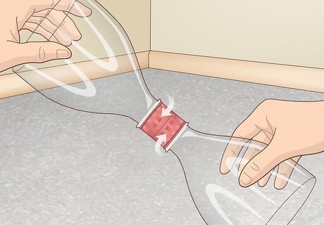 Cut 2 soda bottles in half lengthwise to serve as the hourglass. Draw circular lines around the middle of two 2 L (68 fl oz) bottles. Next, use a pair of scissors to cut around this line, dividing both bottles in half. Once you’re finished cutting, set aside the 2 spout pieces, as these are what you’ll use to make your stool. Consider rinsing out and air-drying the bottles before using them to make a stool.