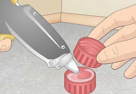 Hot glue the tops of 2 bottle caps together to connect the soda bottles. Locate both of the caps that were used for the old soda bottles. To connect the 2 caps together, apply a small ring of hot glue on the outer surface of 1 cap. Next, press the other cap onto the hot glue for several seconds. Once you stop pressing both items together, hold the caps in 1 hand to ensure that the glue is dry. These caps will help connect and support the center of the “hourglass.” Hot glue dries within a few seconds, so be sure to apply and use it quickly.