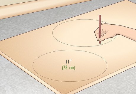 Sketch 2 identical 11 in (28 cm) circles on a 1 in (2.5 cm) thick plank. Arrange a large, 1 in (2.5 cm) thick slab of wood on a flat work surface. Attach a pencil to a compass, then arrange the device in the center of the wood. Rotate the compass in a complete circle so a circular sketch is visible on the wood’s surface. Before you continue, use the compass to draw a second, separate circle. These circles will serve as the top and bottom of your hourglass. Plywood is a great option for this part of the project. Ideally, use a plank that’s at least 1 ft (0.30 m) long and 2 ft (0.61 m) wide.