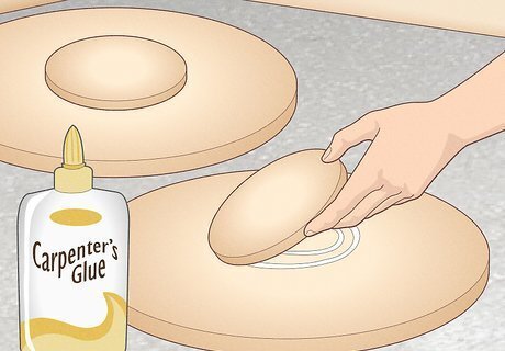 Attach 1 circle to the center of each wooden base with wood glue. Before glueing anything into place, arrange each circle in the middle of a larger wooden base. Once you’ve centered the circle, extend a tape measure from the outer rim of the base circle to the edge of the small, central circle. Perform this measurement from all edges of the base to make sure that the wooden circle is centered. Next, apply a circle of wood glue around this central area, then press the smaller wooden circle into place for several seconds. Both wooden pieces need to be centered for the stool to function correctly. Read the glue’s label to see how much time it needs to fully dry.