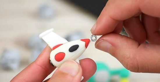 Twist a tiny eyehook screw into the top of each rocket. The eyehook screws look like little screws with loops at the top. Take the pointy end of a screw and push it into the top of a rocket eraser. Then, twist it clockwise (to the right) until just the loop is sticking out of the top of the eraser. Do it again with your other eraser. If you’re not sure how to get the screw to go in, ask a grownup to help you.