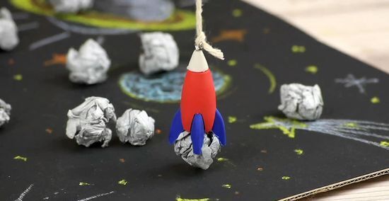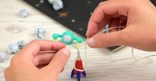 Attach the other end of each string to a craft stick. Take the other end of one of the strings and wrap it around the end of a craft stick, then tie a knot to make it stay. If you’re not sure how, ask a grownup to help you. Do the same thing with your other rocket and string. Now you will have 2 dangly asteroid-catching rocket tools. They will look sort of like fishing poles with rockets instead of hooks!