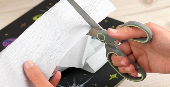 Cut out 14 small pieces of silver tissue paper with scissors. Get the piece of silver tissue that came with your kit and cut it up into 14 pieces. Don’t worry about making the pieces nice and neat. You’ll be crumpling them up to make asteroids. You can make the pieces different sizes if you want, but make sure at least 7 of them are big enough to wrap up your mini magnets.