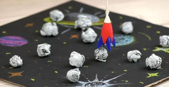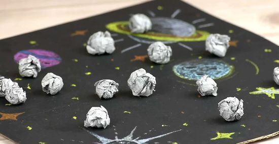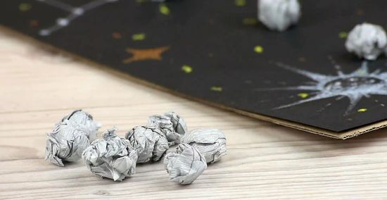 Spread the asteroids out on the game board. Take the tissue asteroids you made and scatter them around all over the game board. Mix them up a bit so you can’t tell which ones have magnets inside and which ones don’t.
