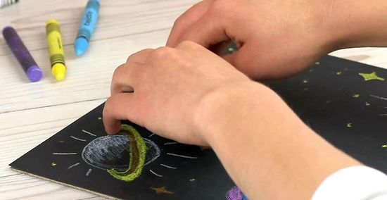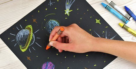 Draw some outer space designs on your black cardstock sheet. Put your black paper sheet on a smooth, flat surface, like a table. Grab some crayons and decorate it with things you can find in outer space, like asteroids, comets, stars, planets, or galaxies. Use your imagination and have fun. You can make your Asteroid Catching game board look however you like! You can also decorate with the outer space stickers that came with your kit.
