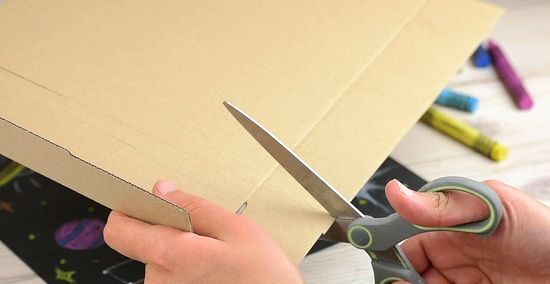 Cut out the lid of the cardboard box your kit came in. Use scissors to cut out the top part of the Asteroid Game box lid. Sit at a table while you work. Be very careful when using the scissors! If you’re having trouble cutting through the cardboard, ask a grownup to help you. Always ask permission before using scissors.