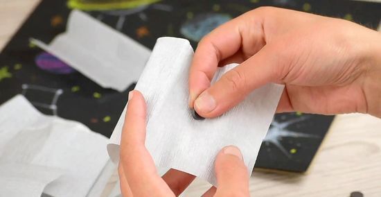 Crumple up 7 more pieces of tissue to make asteroids without magnets. Now, take the pieces of tissue that are left over and roll or crumple them up. Try to make them look like asteroids, too. Mix up all your asteroids together so that the magnetic ones are mixed in with the non-magnetic ones.