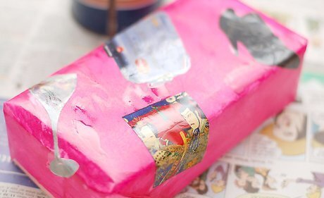 Wrap each brick in a layer of plain colored paper first. This will serve as the base layer over which you'll add the decoupage pieces of paper. Wrap as if you were wrapping a present, only be as neat as you can possibly be and avoid too much overlap at either end or you'll create unevenness.