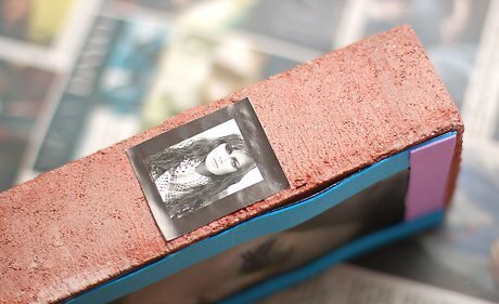 Place the pictures inside the frames and affix to the larger sides of the brick. Use either liquid nails or silicone adhesive to make each frame stick. Hold in place for several minutes while it adheres and bonds to the brick.