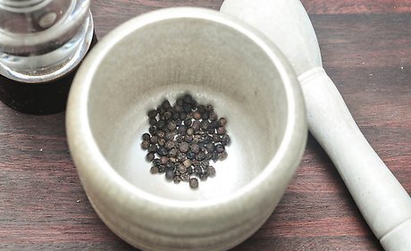 Add the whole spices to a mortar and pestle. Grind the spices coarsely.