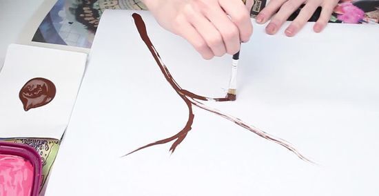 Draw the cherry blossom tree trunk and branches using the black/brown paint and paint brush. Remember that each branch will hold a cherry blossom print to take this into consideration when spacing out branches (and choosing the number of branches). Allow for ample dry time before creating the cherry blossoms. Otherwise the black/brown paint may mix with the cherry blossom color and disturb the integrity of the design.