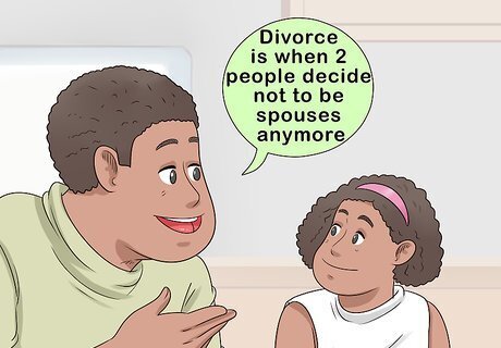 Explain your decision in simple, age-appropriate terms. The right way to tell your child depends on their age. However, for children of any age, stress that the divorce is between you and your former spouse. Assure your child that they have absolutely no reason to blame themselves. If you have a school-age child, tell them, "Divorce is when 2 people decide not to be spouses anymore and move into in separate houses. Sometimes grown-ups change the way they love each other or can't agree about things anymore." Tweens and teens often pick up information from arguments and conversations they've overheard. Since they likely have suspicions, give your older child the opportunity to ask questions when you tell them about the divorce.