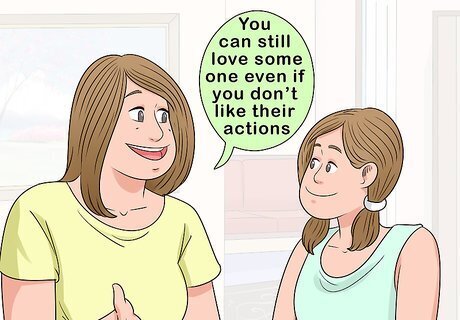 Explain an abusive situation with clear, balanced language. If your former spouse was abusive, try to tailor your language and the level of detail you provide to your child's age. Regardless of your child's age, emphasize that you love them, that children are not responsible for adults' actions, and that everything will be okay. If you are dealing with a physically abusive person, get your children to a safe space before you have this conversation. An older child might not know how to process their feelings, especially if they've witnessed violence. Tell them, “Sometimes someone you love does something wrong, and it's completely normal to feel conflicted. You can still love someone even if you don't like their actions.” For a younger child, try using an analogy to help them understand. You could say, “Remember when Sam hit you and broke your toys? Sometimes grown-ups hit and break things, too. We have to make sure everyone is safe, so you and I will live in a different house from now on.”